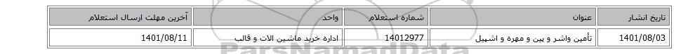 | 1401/08/03 | تأمین واشر و پین و مهره و اشپیل | 14012977 | اداره خرید ماشین الات و قالب | 1401/08/11 |