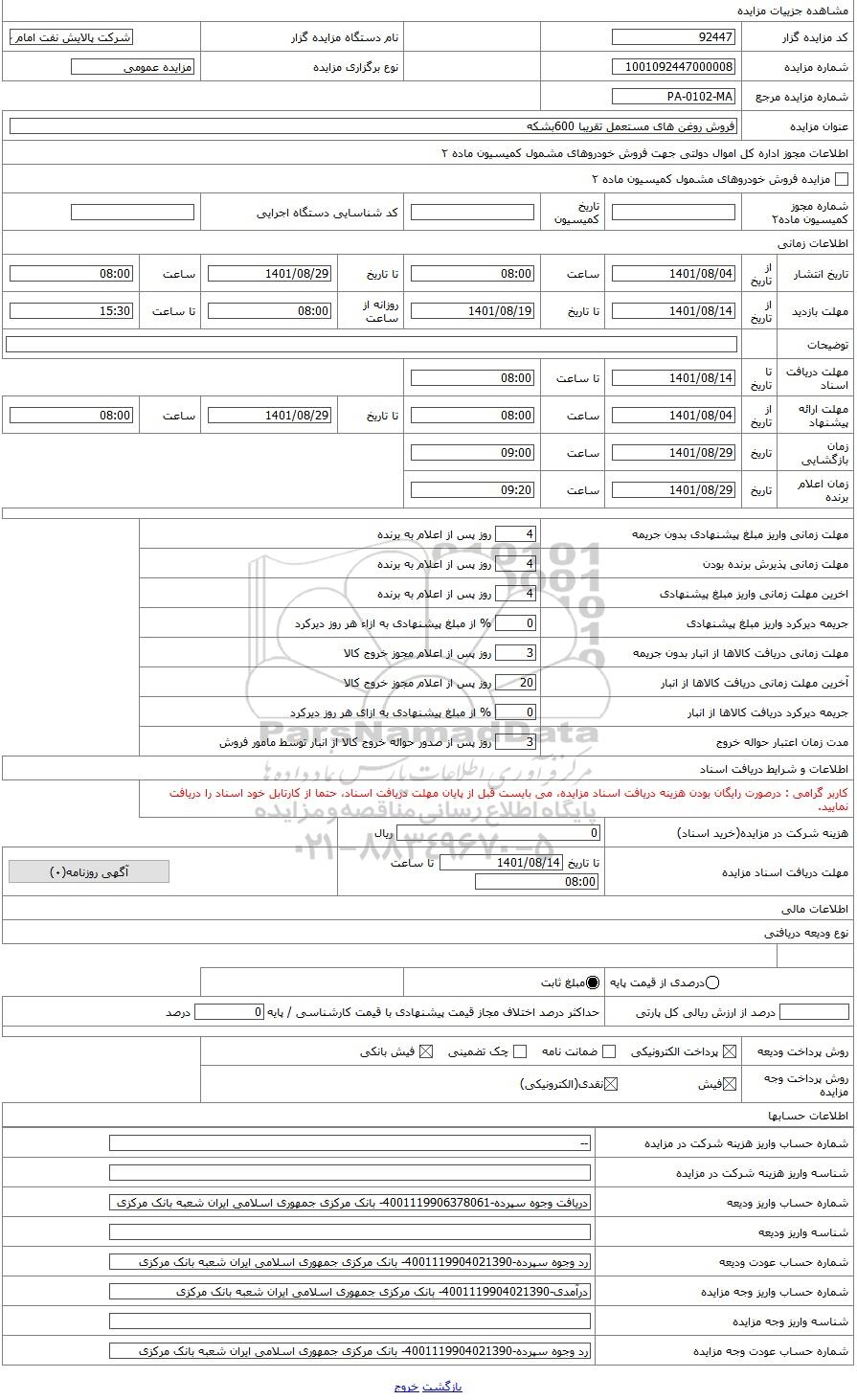 | شماره مزایده مرجع | PA-0102-MA | |||