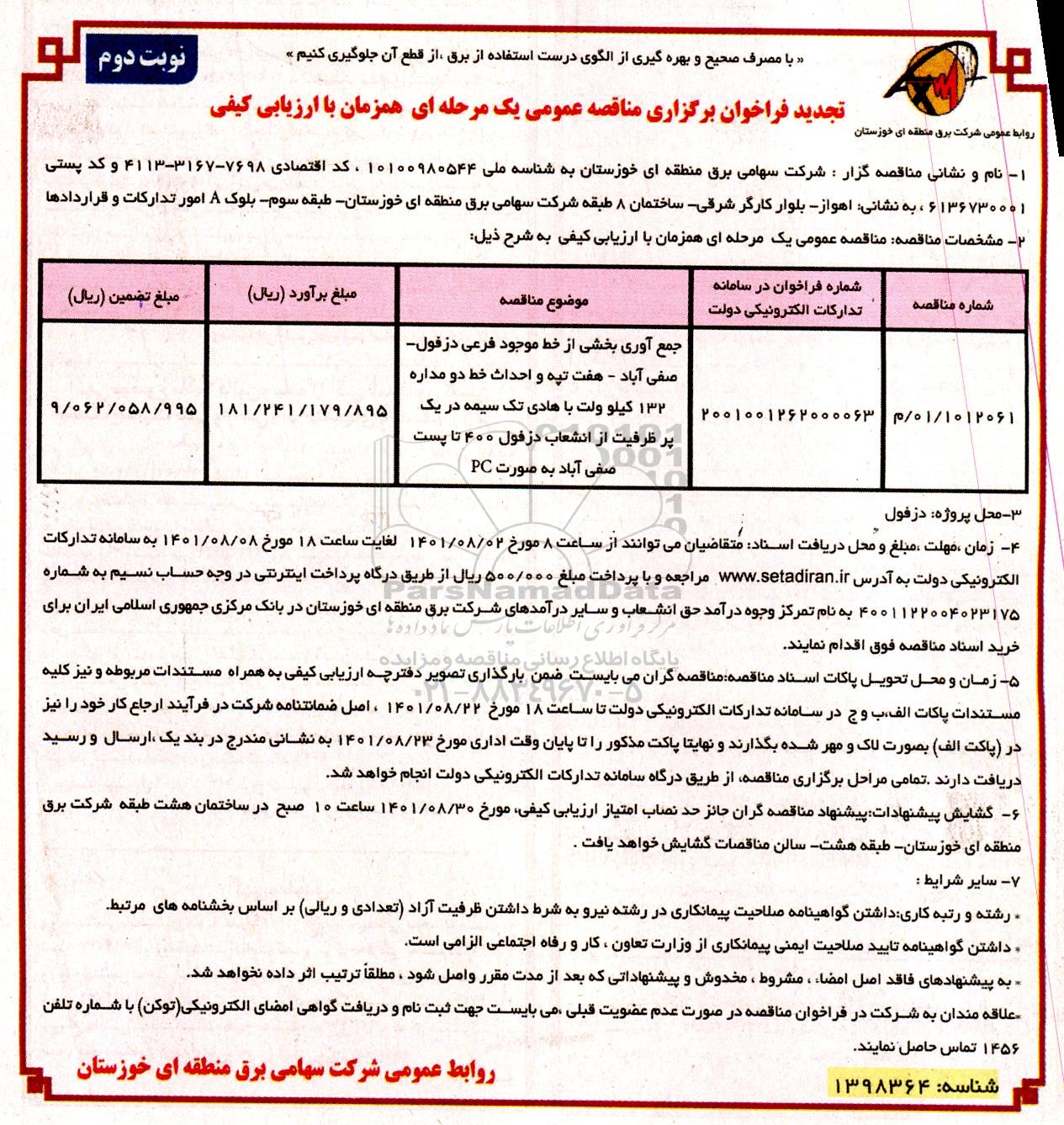 | 1012061/01/م | 2001001262000063 | جمع آوری بخشی از خط موجود فرعی دزفول-صفی آباد-هفت تپه واحداث خط دومداره 132کیلوولت با هادی تکسیمه دریک پر ظرفیت از انشعاب دزفول 400 تا پست صفی اباد به صورت (PC) | 181.241.179.895 | 9.062.058.995 |
