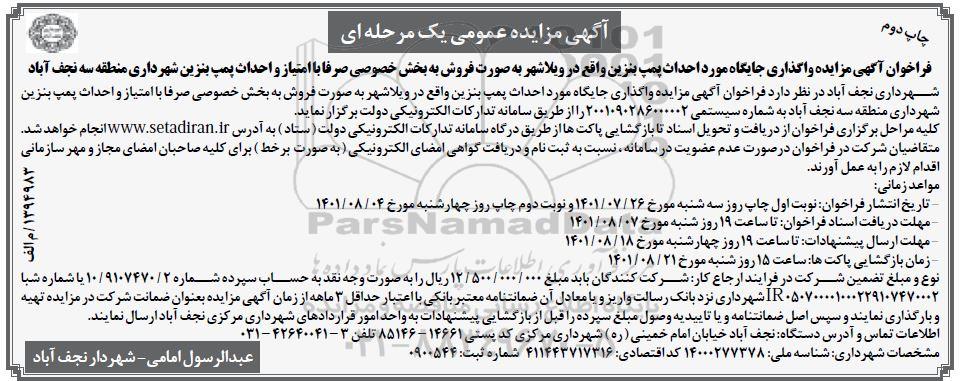 فراخوان آگهی مزایده واگذاری جایگاه مورد احداث پمپ بنزین واقع در ویلاشهر به صورت فروش به بخش خصوصی صرفا با امتیاز و احداث پمپ بنزین شهرداری منطقه سه نجف آباد