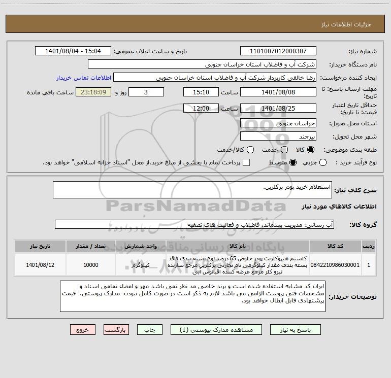 شرح کلی نیاز: استعلام خرید پودر پرکلرین.