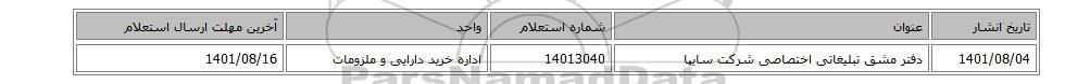 | 1401/08/04 | دفتر مشق تبلیغاتی اختصاصی شرکت سایپا | 14013040 | اداره خرید دارایی و ملزومات | 1401/08/16 |