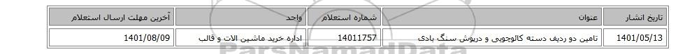 | 1401/05/13 | تامین دو ردیف دسته کائوچویی و درپوش سنگ بادی | 14011757 | اداره خرید ماشین الات و قالب | 1401/08/09 |