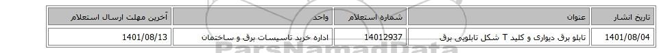 | 1401/08/04 | تابلو برق دیواری و کلید T شکل تابلویی برق | 14012937 | اداره خرید تاسیسات برق و ساختمان | 1401/08/13 |