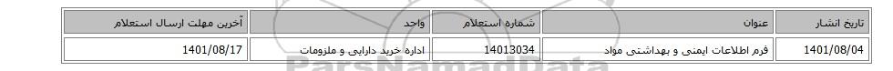 | 1401/08/04 | فرم اطلاعات ایمنی و بهداشتی مواد | 14013034 | اداره خرید دارایی و ملزومات | 1401/08/17 |