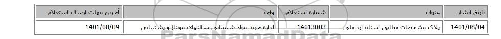 | 1401/08/04 | پلاک مشخصات مطابق استاندارد ملی | 14013003 | اداره خرید مواد شیمیایی سالنهای مونتاژ و پشتیبانی | 1401/08/09 |