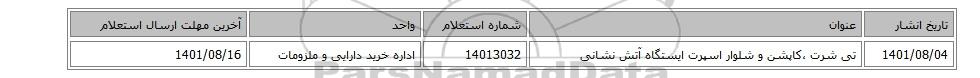 | 1401/08/04 | تی شرت ،کاپشن و شلوار اسپرت ایستگاه آتش نشانی | 14013032 | اداره خرید دارایی و ملزومات | 1401/08/16 |