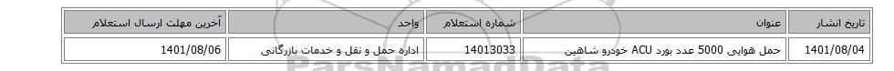 | 1401/08/04 | حمل هوایی 5000 عدد بورد ACU خودرو شاهین | 14013033 | اداره حمل و نقل و خدمات بازرگانی | 1401/08/06 |