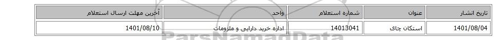 | 1401/08/04 | استکان چای | 14013041 | اداره خرید دارایی و ملزومات | 1401/08/10 |