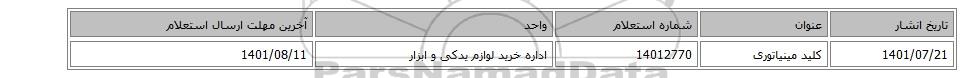 | 1401/07/21 | کلید مینیاتوری | 14012770 | اداره خرید لوازم یدکی و ابزار | 1401/08/11 |