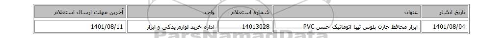 | 1401/08/04 | ابزار محافظ جازن پلوس تیبا اتوماتیک جنس PVC | 14013028 | اداره خرید لوازم یدکی و ابزار | 1401/08/11 |