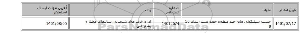 | 1401/07/17 | چسب سیلیکونی مایع چند منظوره حجم بسته بندی 50 g | 14012674 | اداره خرید مواد شیمیایی سالنهای مونتاژ و پشتیبانی | 1401/08/05 |