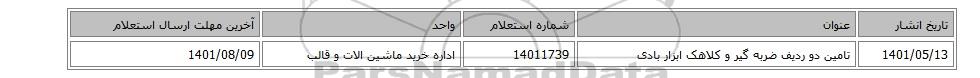| 1401/05/13 | تامین دو ردیف ضربه گیر و کلاهک ابزار بادی | 14011739 | اداره خرید ماشین الات و قالب | 1401/08/09 |