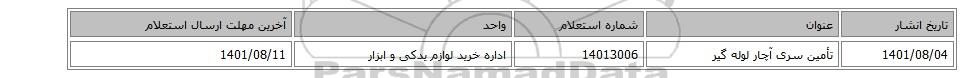 | 1401/08/04 | تأمین سری آچار لوله گیر | 14013006 | اداره خرید لوازم یدکی و ابزار | 1401/08/11 |