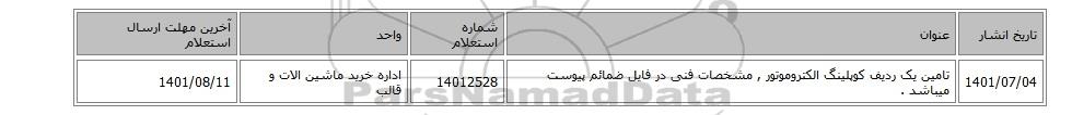 | 1401/07/04 | تامین یک ردیف کوپلینگ الکتروموتور , مشخصات فنی در فایل ضمائم پیوست میباشد . | 14012528 | اداره خرید ماشین الات و قالب | 1401/08/11 |