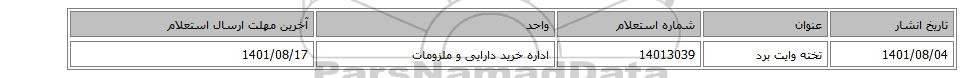 | 1401/08/04 | تخته وایت برد | 14013039 | اداره خرید دارایی و ملزومات | 1401/08/17 |