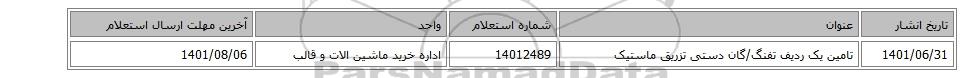 | 1401/06/31 | تامین یک ردیف تفنگ/گان دستی تزریق ماستیک | 14012489 | اداره خرید ماشین الات و قالب | 1401/08/06 |