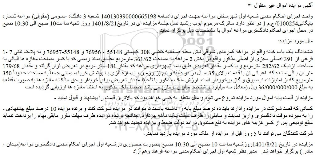 - مزایده در تاریخ 1401/8/21روزشنبه ساعت 10 صبح الی 10:30 صبح بصورت حضوری درشعبه اول اجرای احکام مدنی دادگستری مراغه(میدان مادر ) برگزار خواهد شد.   مدیر دفتر شعبه اول اجرای احکام مدنی مراغه-فرهاد وهم آزاد