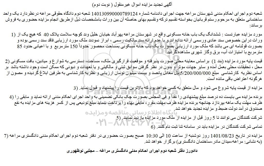 شعبه دوم اجرای احکام مدنی شهرستان مراغه جهت اجرای دادنامه شماره 140130990000789124 شعبه دوم دادگاه حقوقی مراغه درنظردارد یک واحد ساختمانی متعلق به مرحوم رستم قربانیان بخواسته تقسیم ترکه وتقسیم بهای حاصله آن بین وراث بامشخصات ذیل ازطریق انجام مزایده حضوری به فروش برساند: