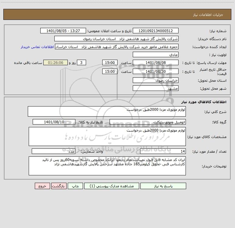 نام دستگاه خریدار:شرکت پالایش گاز شهید هاشمی نژاد استان خراسان رضوی