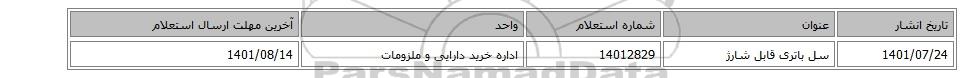 | 1401/07/24 | سل باتری قابل شارژ | 14012829 | اداره خرید دارایی و ملزومات | 1401/08/14 |