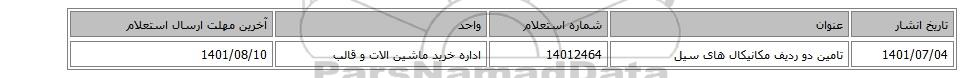 | 1401/07/04 | تامین دو ردیف مکانیکال های سیل | 14012464 | اداره خرید ماشین الات و قالب | 1401/08/10 |