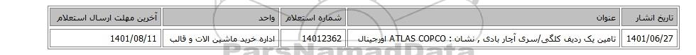 | 1401/06/27 | تامین یک ردیف کلگی/سری آچار بادی , نشان : ATLAS COPCO اورجینال | 14012362 | اداره خرید ماشین الات و قالب | 1401/08/11 |