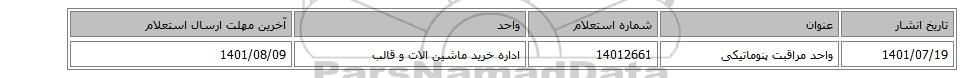 | 1401/07/19 | واحد مراقبت پنوماتیکی | 14012661 | اداره خرید ماشین الات و قالب | 1401/08/09 |