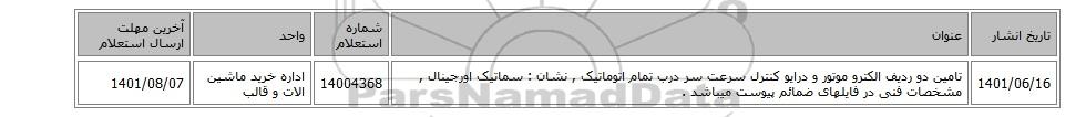 | 1401/06/16 | تامین دو ردیف الکترو موتور و درایو کنترل سرعت سر درب تمام اتوماتیک , نشان : سماتیک اورجینال , مشخصات فنی در فایلهای ضمائم پیوست میباشد . | 14004368 | اداره خرید ماشین الات و قالب | 1401/08/07 |