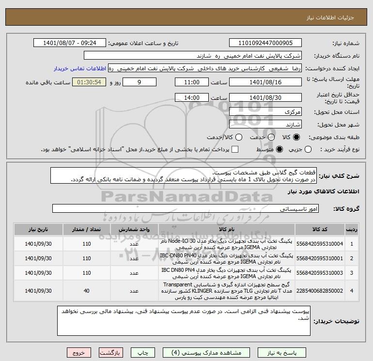 | 1 | 5568420595310004 | پکینگ تخت آب بندی تجهیزات دیگ بخار مدل Node-IO 30 نام تجارتی IGEMA مرجع عرضه کننده آرین شیمی | عدد | 110 | 1401/09/30 |