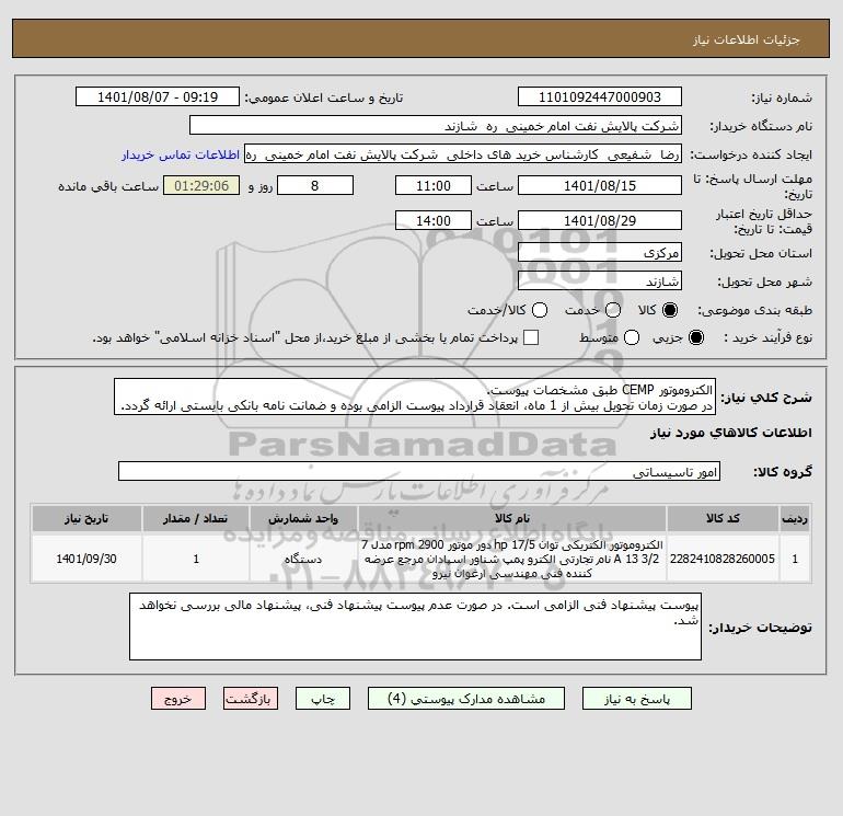 شرح کلی نیاز: الکتروموتور CEMP طبق مشخصات پیوست.