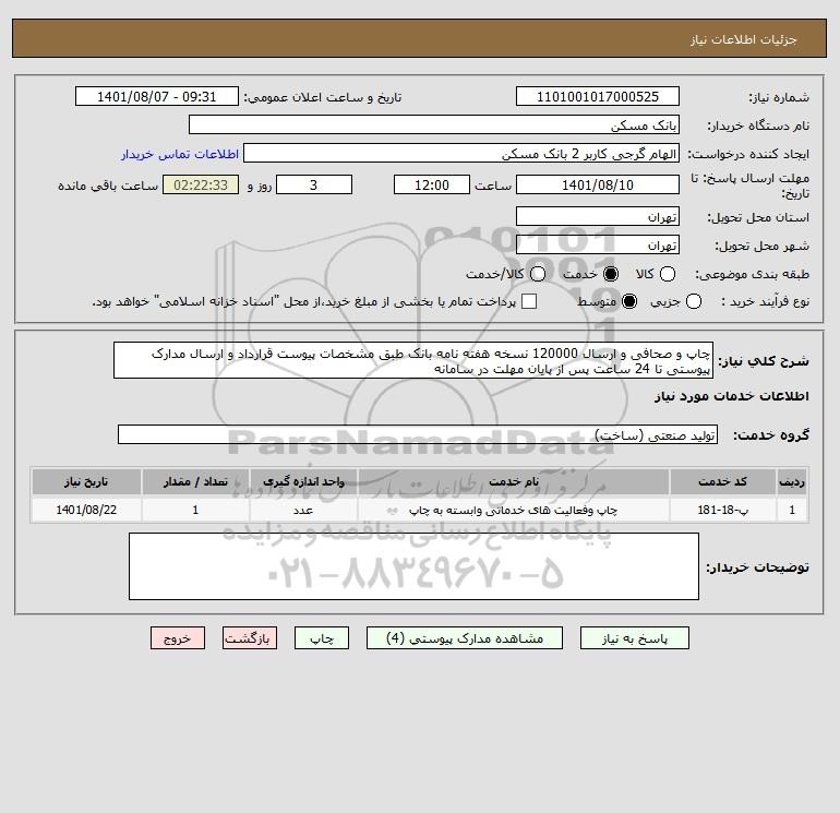 شرح کلی نیاز: چاپ و صحافی و ارسال 120000 نسخه هفته نامه بانک طبق مشخصات پیوست قرارداد و ارسال مدارک پیوستی تا 24 ساعت پس از پایان مهلت در سامانه
