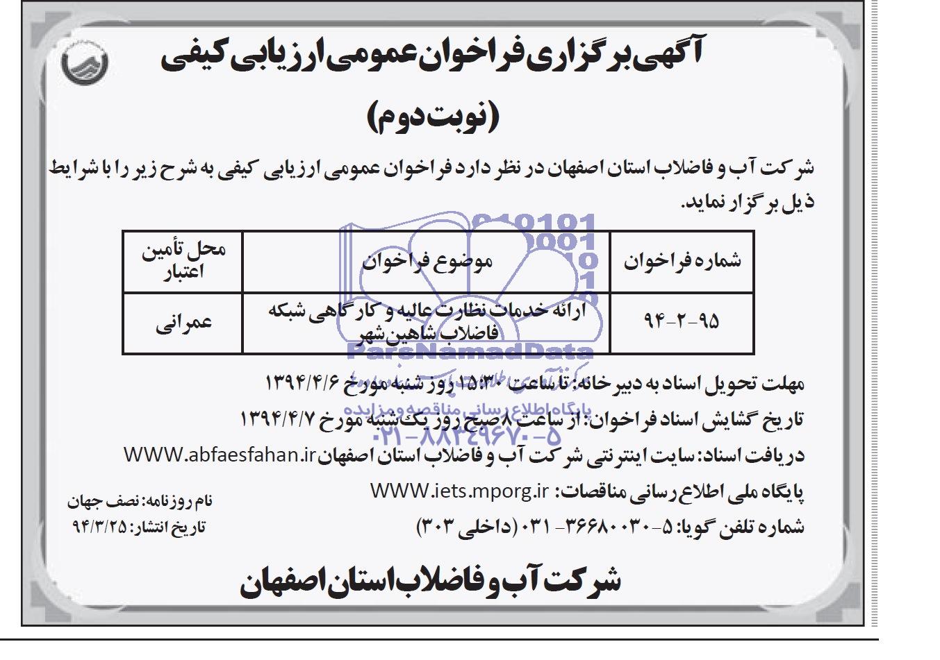 شماره فراخوان 94-2-95 موضوع فراخوان ارائه خدمات نظارت عالیه و کارگاهی شبکه فاضلاب شاهین شهر محل تامین اعتبار عمرانی