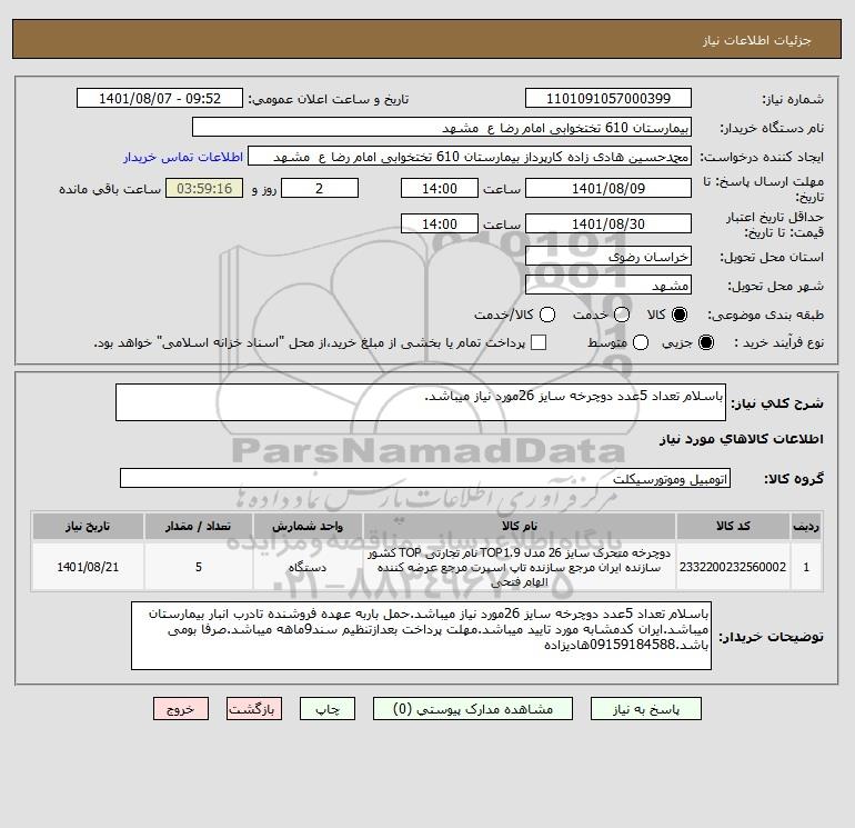 شرح کلی نیاز: باسلام تعداد 5عدد دوچرخه سایز 26مورد نیاز میباشد.