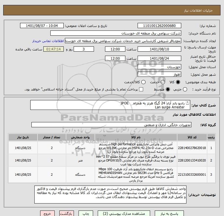 شرح کلی نیاز: رادیو باند آزاد 24 گیگا هرتز به همراه POE(