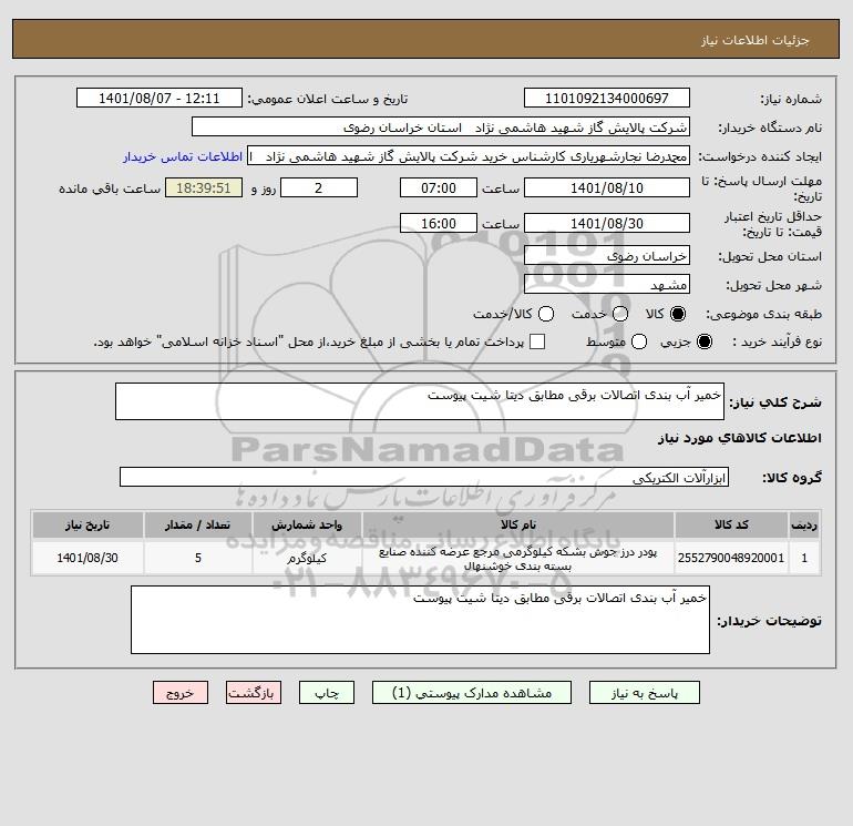نام دستگاه خریدار:شرکت پالایش گاز شهید هاشمی نژاد استان خراسان رضوی