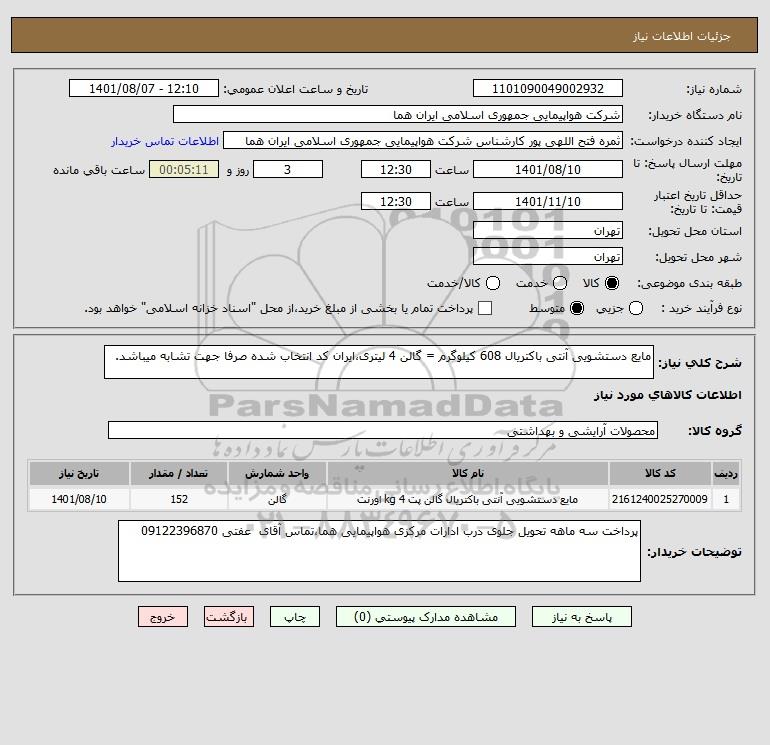 شرح کلی نیاز: مایع دستشویی آنتی باکتریال 608 کیلوگرم = گالن 4 لیتری،ایران کد انتخاب شده صرفا جهت تشابه میباشد.