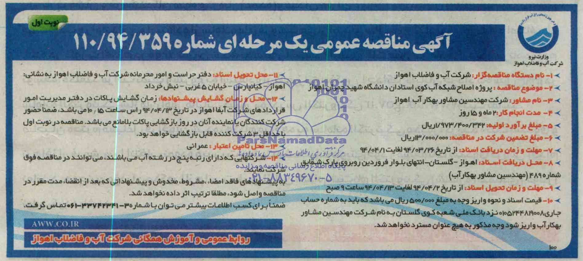 محل و زمان گشایش پیشنهادها: زمان گشایش پاکات در دفتر مدیریت قراردادهای شرکت آبفای اهواز در تاریخ 94.4.13 رأس ساعت 10/15 می باشد. ضمناً حضور شرکت کنندگان یا نماینده آنان در روز بازگشایی پاکات بلامانع می باشد. مناقصه در نوبت اول حداقل 3 شرکت کننده قابل بازگشایی خواهد بود