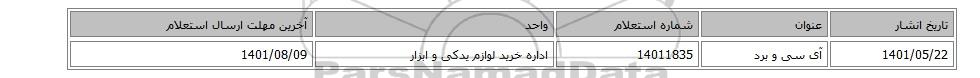 | 1401/05/22 | آی سی و برد | 14011835 | اداره خرید لوازم یدکی و ابزار | 1401/08/09 |