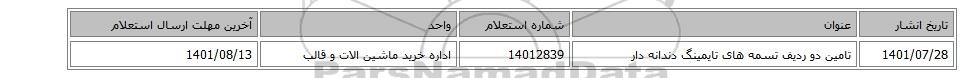 | 1401/07/28 | تامین دو ردیف تسمه های تایمینگ دندانه دار | 14012839 | اداره خرید ماشین الات و قالب | 1401/08/13 |