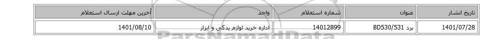 | 1401/07/28 | برد BD530/531 | 14012899 | اداره خرید لوازم یدکی و ابزار | 1401/08/10 |