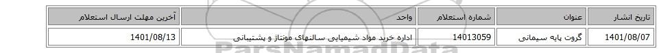 | 1401/08/07 | گروت پایه سیمانی | 14013059 | اداره خرید مواد شیمیایی سالنهای مونتاژ و پشتیبانی | 1401/08/13 |