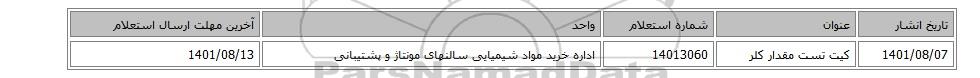 | 1401/08/07 | کیت تست مقدار کلر | 14013060 | اداره خرید مواد شیمیایی سالنهای مونتاژ و پشتیبانی | 1401/08/13 |