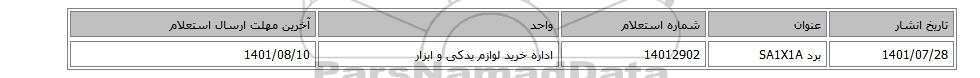 | 1401/07/28 | برد SA1X1A | 14012902 | اداره خرید لوازم یدکی و ابزار | 1401/08/10 |