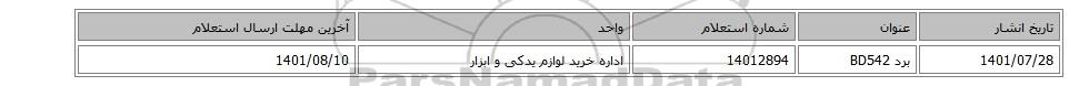 | 1401/07/28 | برد BD542 | 14012894 | اداره خرید لوازم یدکی و ابزار | 1401/08/10 |