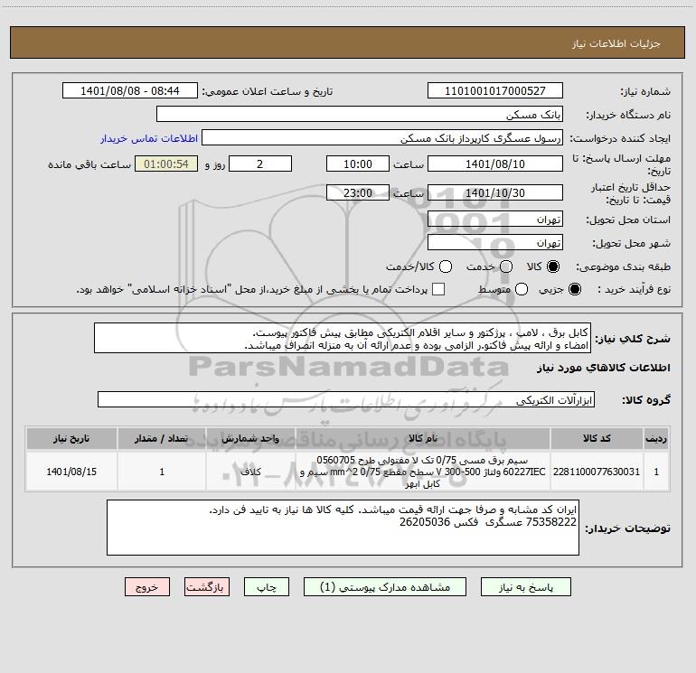 شرح کلی نیاز: کابل برق ، لامپ ، پرژکتور و سایر اقلام الکتریکی مطابق پیش فاکتور پیوست. امضاء و ارائه پیش فاکتو.ر الزامی بوده و عدم ارائه آن به منزله انصراف میباشد.