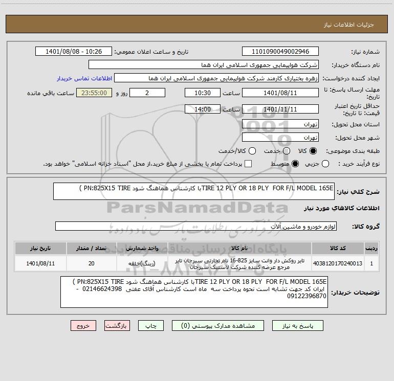 شرح کلی نیاز: TIRE 12 PLY OR 18 PLY FOR F/L MODEL 165Eبا کارشناس هماهنگ شود PN:825X15 TIRE )
