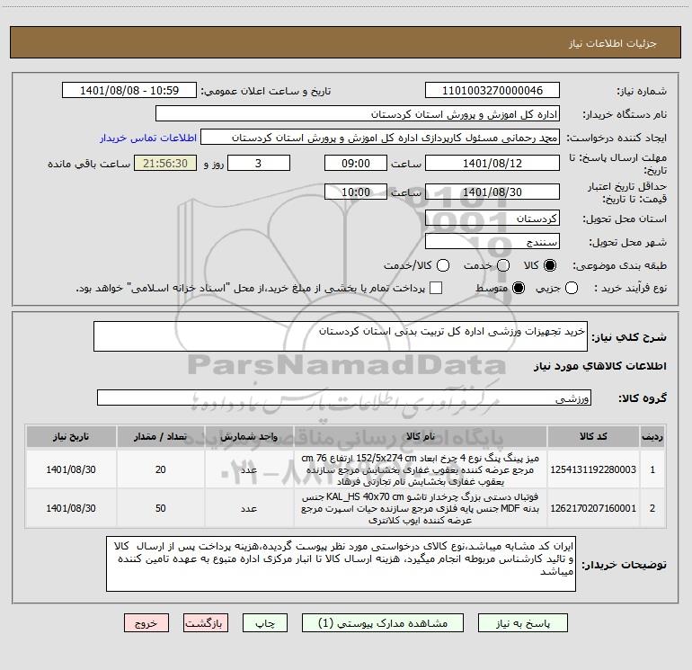 شرح کلی نیاز: خرید تجهیزات ورزشی اداره کل تربیت بدنی استان کردستان