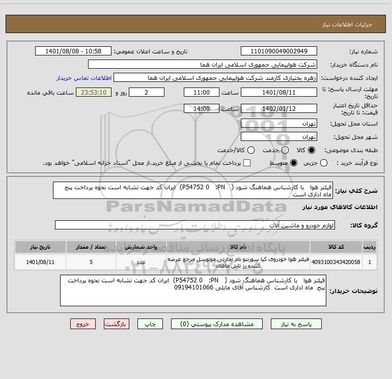 شرح کلی نیاز: فیلتر هوا با کارشناس هماهنگ شود ( P54752 0 :PN) ایران کد جهت تشابه است نحوه پرداخت پنج ماه اداری است