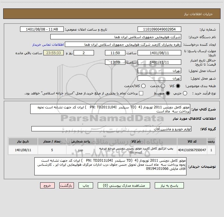توضیحات خریدار:موتور کامل دویتس 2011 توربودار (TD) 4 سیلندر PN: TD2011L04I ) ایران کد جهت تشابه است نحوه پرداخت سه ماه است محل تحویل جنس جلوی درب ادارات مرکزی هواپیمایی ایران ایر . کارشناس آقای مایلی 09194101066